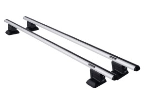 Kompletny, aluminiowy bagażnik bazowy pasujący do wielu samochodów z fabrycznie przygotowanymi gwintami pionowymi.