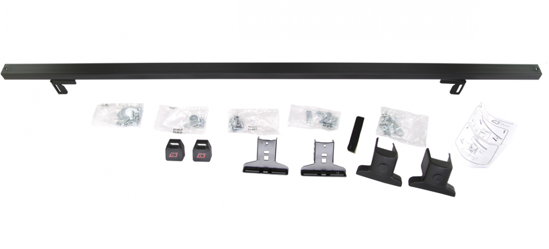 W zestawie znajdują się 2 belki ze stopami i mocowaniami oraz śruby dopasowujące (kity) pozwalające zamontować bagażnik do konkretnych modeli samochodów.