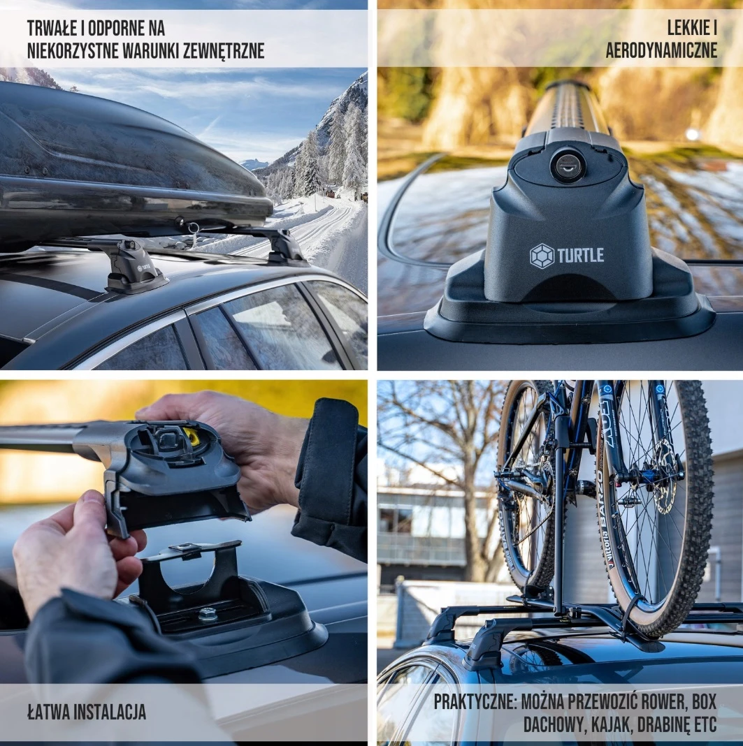 Dzięki zastosowaniu rowka T Belki pasują do większości dostępnych na rynku akcesoriów (box dachowy, uchwyty na nart, uchwyty na rower).