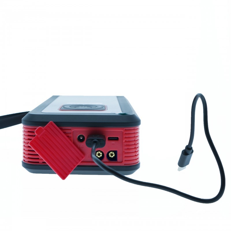 Wbudowany akumulator o pojemności 4× 2000 mAh (14.8 V) umożliwia bezprzewodowe działanie oraz ładowanie urządzeń mobilnych przez port USB (5 V / 2.4 A). Kompresor może również służyć jako awaryjny booster do uruchomienia pojazdu – prąd rozruchowy wynosi maksymalnie 500 A. W zestawie znajdują się inteligentne przewody rozruchowe z pełnym pakietem zabezpieczeń: przed iskrzeniem, odwrotną polaryzacją, przeciążeniem i przegrzaniem.