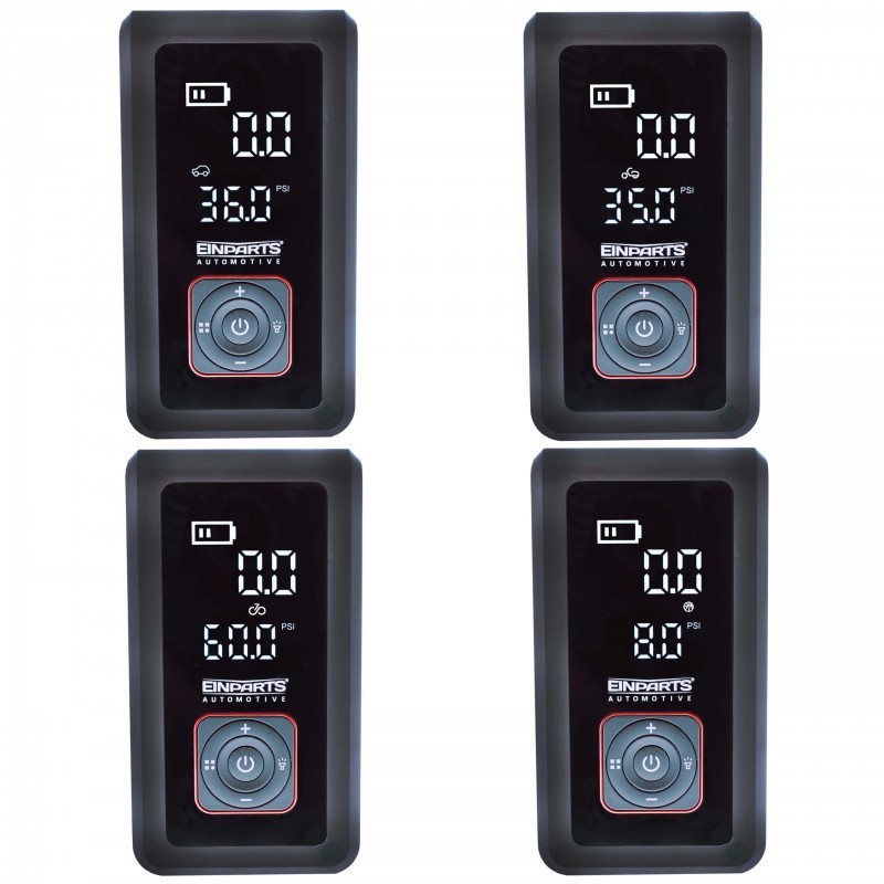 Dzięki maksymalnemu ciśnieniu 150 PSI i wydajności 20 l/min kompresor doskonale sprawdza się przy pompowaniu opon samochodowych, motocyklowych, rowerowych, materacy oraz piłek. Czas napompowania od 0 do 2.5 bara wynosi ok. 10–11 minut. Urządzenie oferuje 4 predefiniowane tryby pracy: samochód, motocykl, rower i piłka – co ułatwia szybkie ustawienie odpowiedniego ciśnienia bez konieczności ręcznego programowania. Skala ciśnienia mieści się w zakresie od 14,5 do 51 PSI.