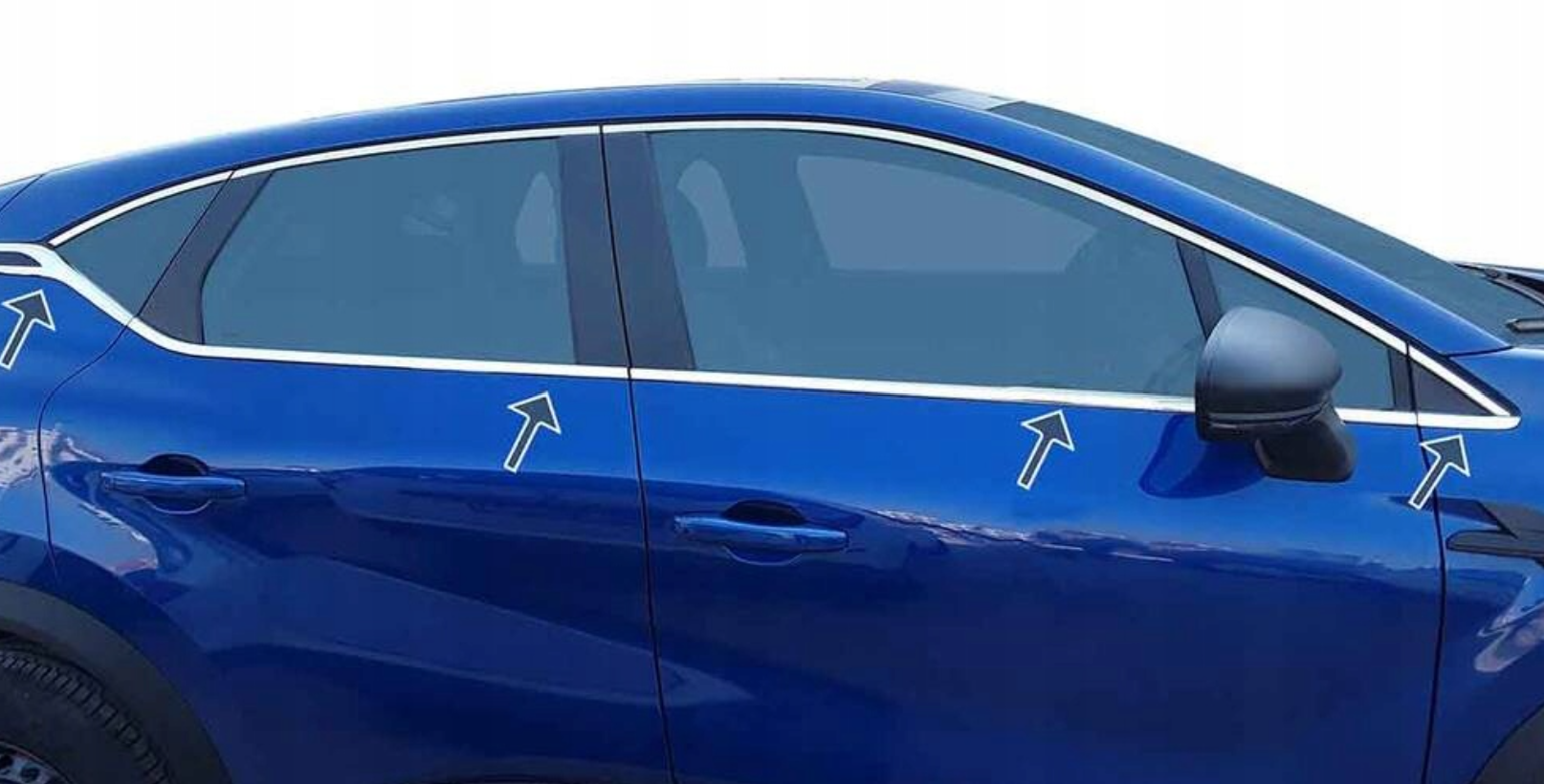 Listwy pod szyby są dedykowane do aut, które nie posiadają fabrycznych listew chrom. Produkt jest naklejany za pomocą taśmy 3M na czarne uszczelki.
