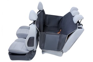Wersja z bokami i zamkiem – Stabilne usztywniane boki chronią drzwi i tapicerkę oraz boczną krawędź fotela przed zanieczyszczeniami. Zamek umożliwia jednoczesne przewożenie psa wraz z pasażerem (wystarczy odpiąć zamek i klamerkę z zagłówka)