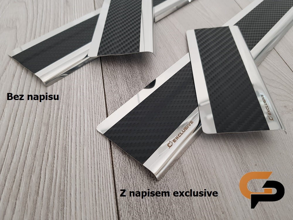 Listwy wykonane są ze stali szlachetnej i dodatkowo oklejone folią carbon. Nakładki dzięki okleinie są jeszcze bardziej odporne na zarysowania niż standardowe listwy stalowe.