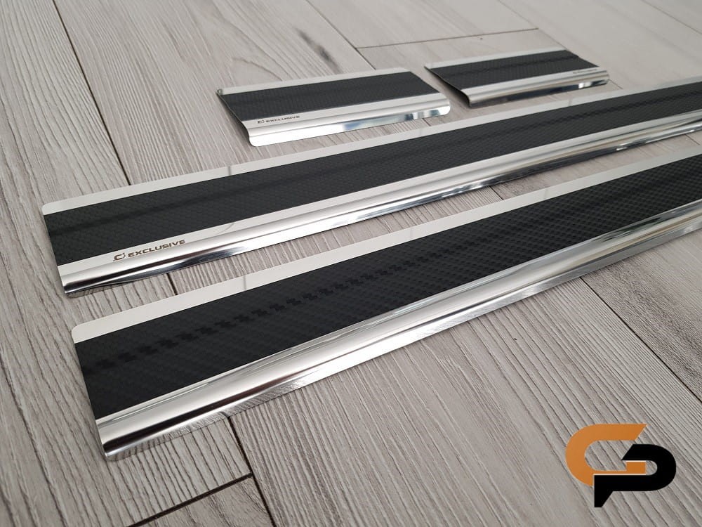 Listwy wykonane są ze stali szlachetnej i dodatkowo oklejone folią carbon. Nakładki dzięki okleinie są jeszcze bardziej odporne na zarysowania niż standardowe listwy stalowe.
