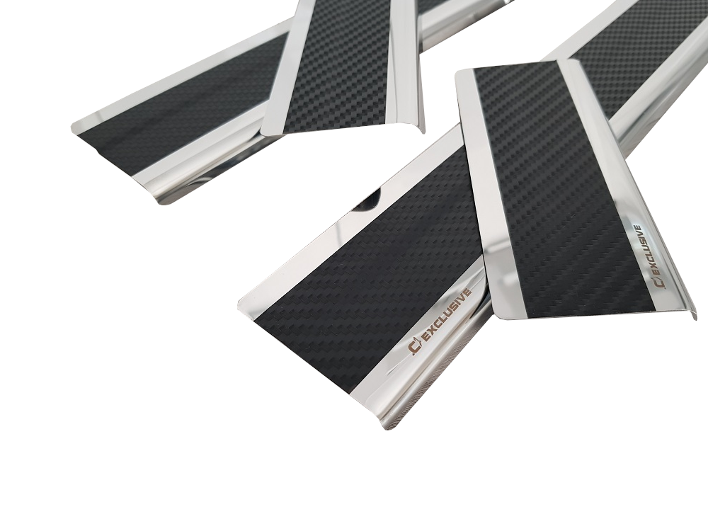 Listwy wykonane są ze stali szlachetnej i dodatkowo oklejone folią carbon. Nakładki dzięki okleinie są jeszcze bardziej odporne na zarysowania niż standardowe listwy stalowe.